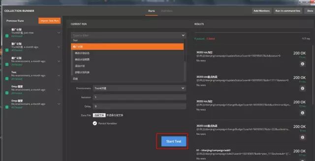 Postman还支持一键运行整个集合内的测试,点击Start Test按钮,Postman将会开始运行某个集合内的所有request,并显示运行的结果: