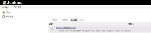 在jenkins的系统管理--》管理插件中,选择android emulator plugin进行安装。安装插件后,在已安装列表中可以查看到该插件。