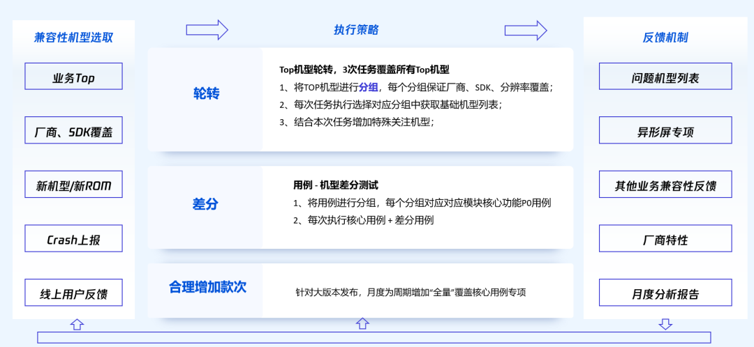 - 层级划分:将Top机型分组开展兼容测试,确保P0级核心用例在Top机型全面覆盖。根据待测场景的特点,将机型与用例进行二次筛选,通过差分测试覆盖中长尾机型和更多场景。