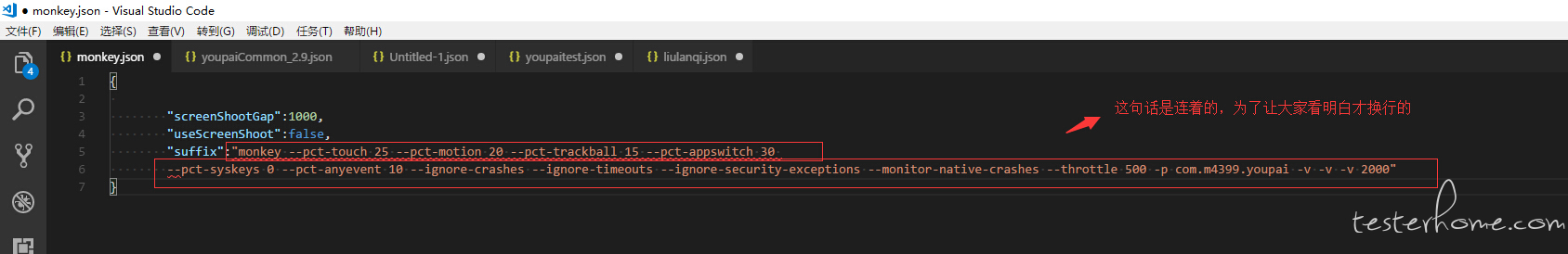 其中有一点还要注意就是在公用的脚本中,duration 可以控制monkey执行时间,如执行100s或者根据monkey的事件数执行。如: