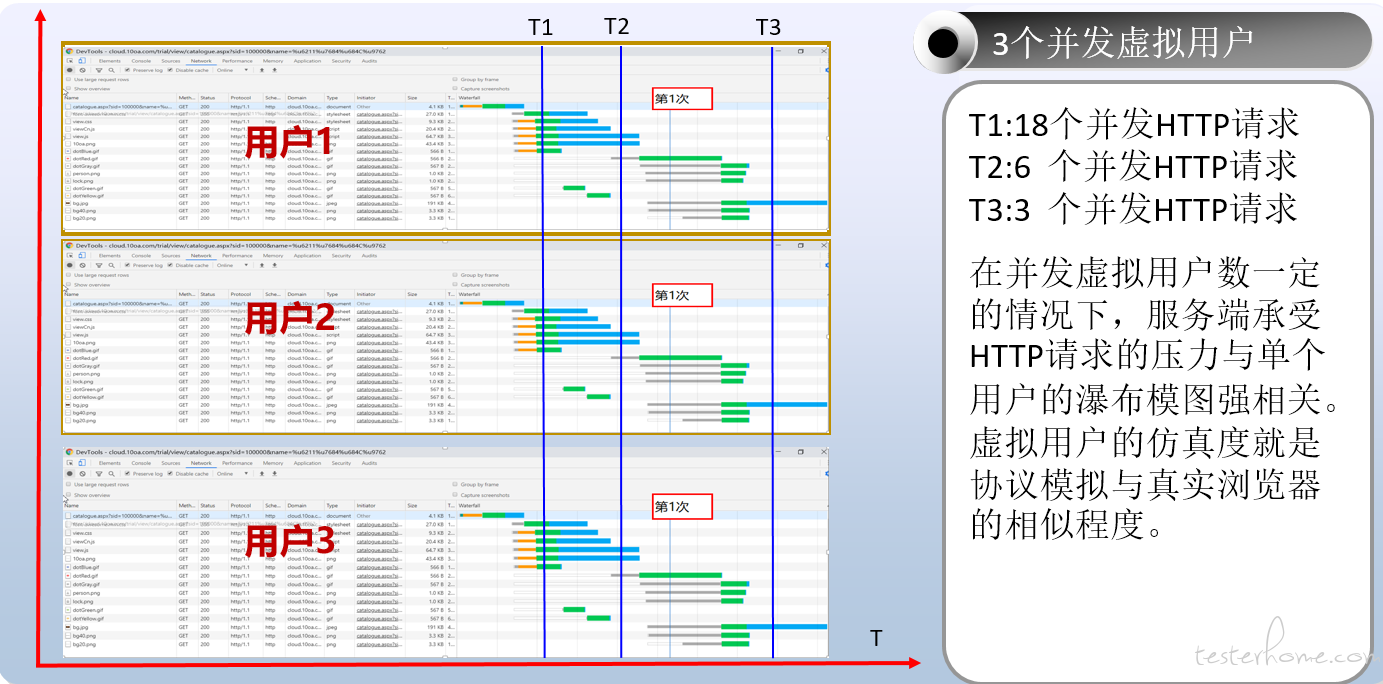 每一个终端用户的操作都是一个瀑布图,下图是三个终端用户坐标图,用以说明服务端与客户端之间的关系,以及客户端的瀑布图对服务端产生压力的原理性说明。