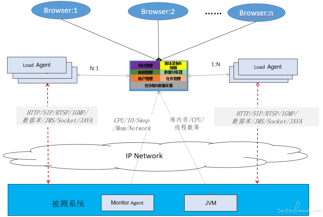 一款好的性能测试工具的应当是分布式系统。目前业界大部分性能测试工具都是C/S架构(如:loadRunner ,Jmeter),kylinTOP测试与监控平台架构是采用B/S架构。