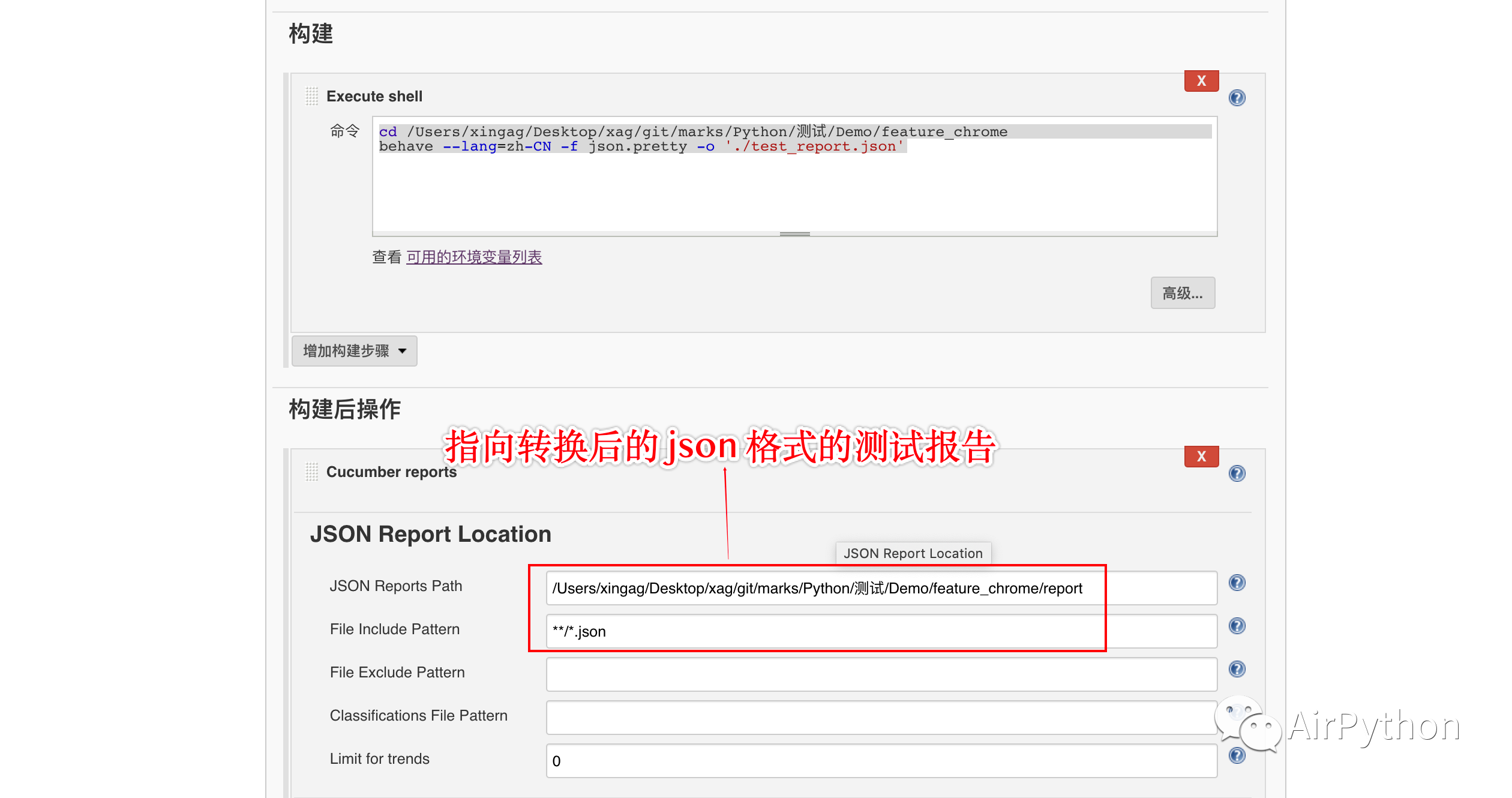 最后,添加构建后的操作 - Cucumber reports,指向第 4 步转换后的 json 格式的测试报告