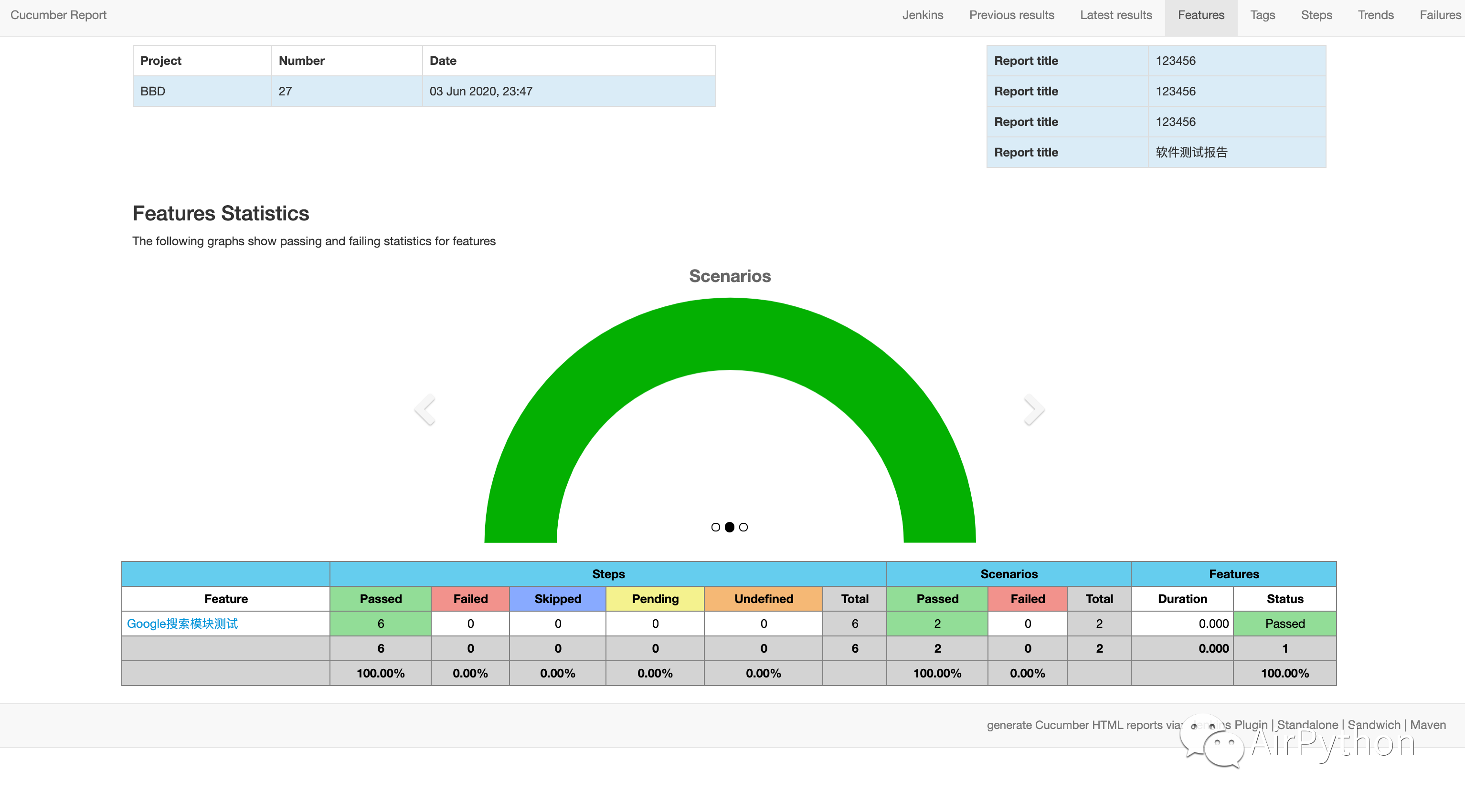 为了保证下一步在 Jenkins 中能正常显示测试报告,需要将 behave 生成的测试报告转换为 cucumber 兼容的 json 测试报告