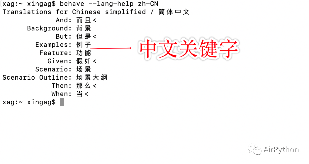 使用 behave --lang-help zh-CN 命令查看所有的中文关键字: